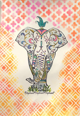 There are so many bright colors in India, I wanted to capture some of that, so used stencils and Oxide inks in pinks and oranges around the elephant.