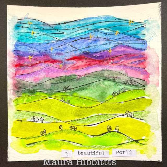 I began by stamping the image onto watercolor paper, then painted the scene with watercolor paint. This shot shows the transition from land to sky. I can't decide if the purple are distant mountains or the sky.